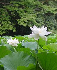 この池では、6月~8月頃に、大輪の白い花をつけるハス、『一天四海』が見頃となります。毎年7月第一日曜日の早朝には、ハスの開花を見る『観蓮節』が催され、茶席も設けられます。