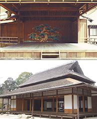 ここからは見えませんが、正面の建物の奥には『能舞台』があります。その『能舞台』を囲むように正面手前に見える茅葺きの建物『栄唱の間』と左側に『墨流しの間』があり、能を鑑賞する場所『見所』となっています。